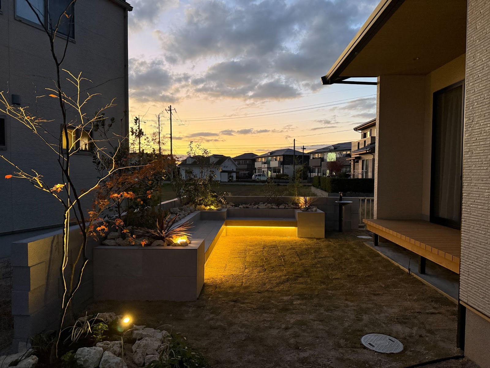 植栽をふんだんに取り入れ、季節の移ろいを楽しめる平屋です。庭は芝生で仕上げられており、花壇ではガーデニングを楽しめます。玄関にある木は、季節を楽しめるだけでなく、照明を利用して、昼夜で印象を変えているのも風情を感じられるポイントです。